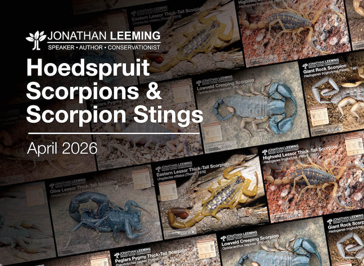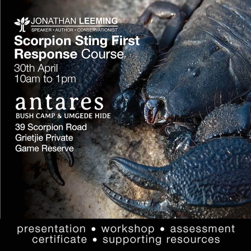 I'll be visiting the Hoedspruit area at the end of April 2026 for a series of private and public Scorpion Sting First Response courses and events. This is a great opportunity to step up to the leadership challenge of scorpion sting first response in your organisation and community. Attend a public event, host your own event or get a copy of the book, workbook and self study.