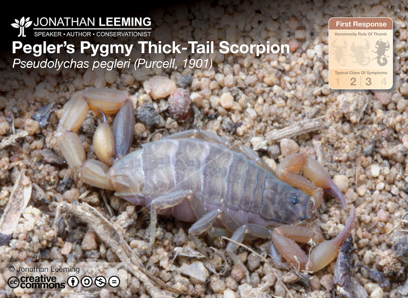 The Pegler’s Pygmy Thick-Tail Scorpion (Pseudolychas pegleri), is a small scorpion with an average length about 25mm. Overall colouration dark-brown to reddish-brown throughout it’s range. Shape of venom vesicle is characteristic being large with a short recurved sting.