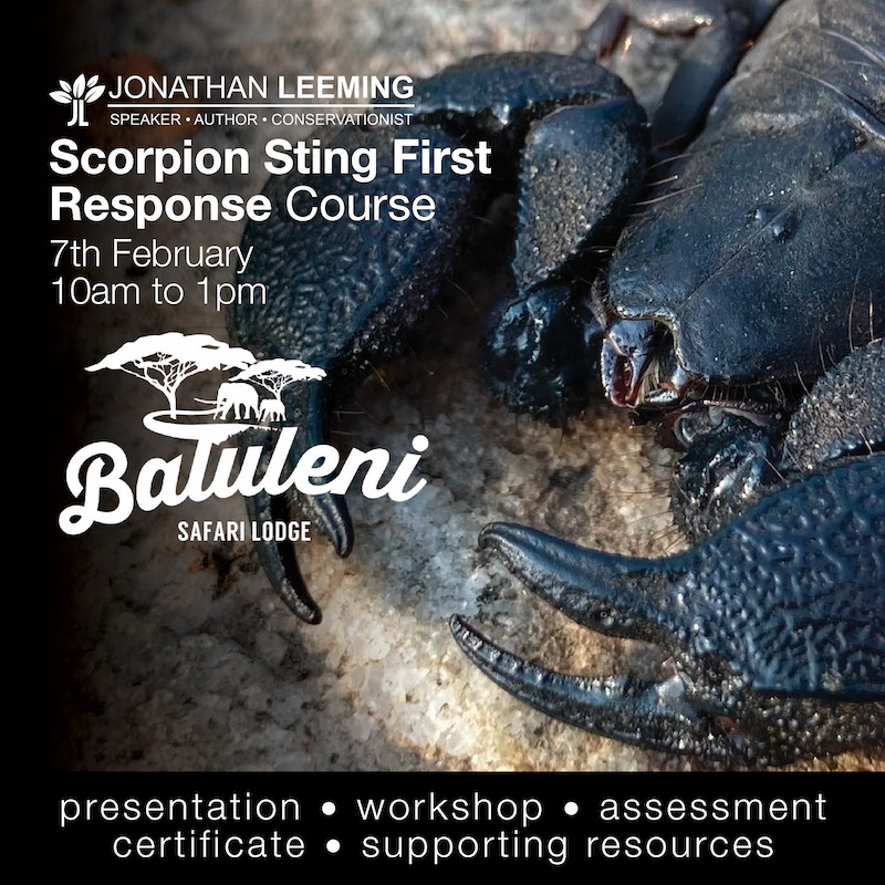 Jonathan will be at Baluleni Safari Lodge on Saturday 7th February where he will be presenting a Scorpion Sting First Response Course and a Scorpion Sting First Response Presentation. Places are limited and bookings are required to secure your place!