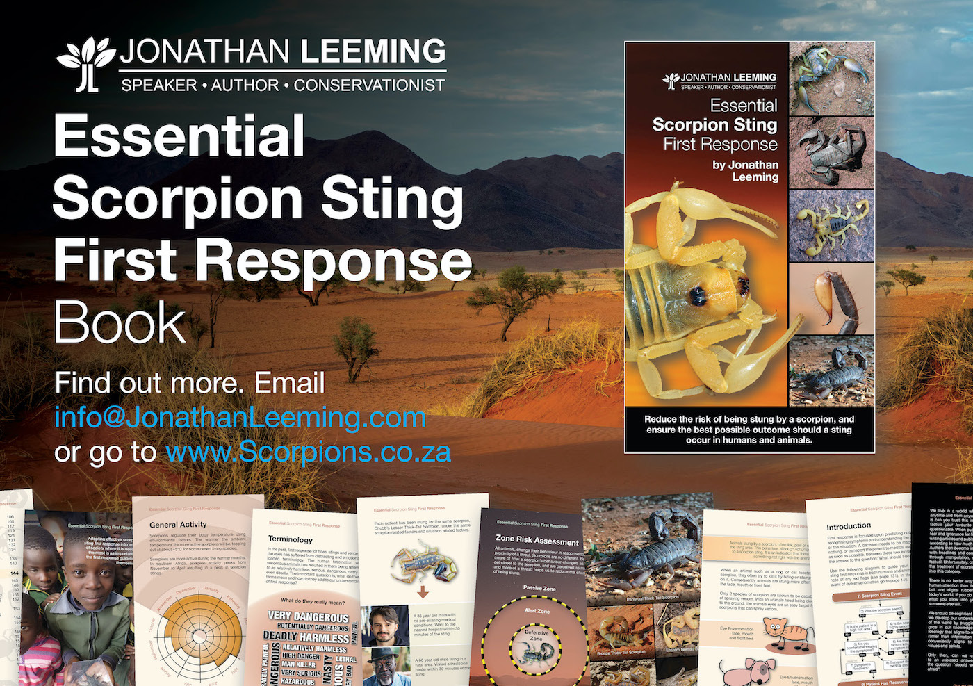 No problem! You can still step up to the leadership challenge of scorpion sting first response in your organisation and community. The Essential Scorpion Sting First Response Book is avaialbe and can be couriered to you. For professional development of career driven individuals such as guides and lodge staff, the Distance Learning Course allows participants to study in their own time and at own own pace. Contact Jonathan on Info@JonathanLeeming.com for further details or click on the links below.