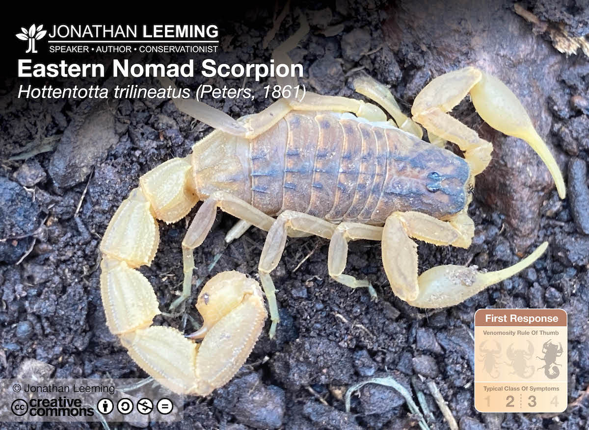 The Eastern Nomad Scorpion is a medium sized scorpion with an average of 50mm.. Characteristic 3 dark ridges on the carapace and termites differentiate this scorpion from all other species. Sting is bulbous. Shelters under rocks in a scrape. Common in areas where they occur.