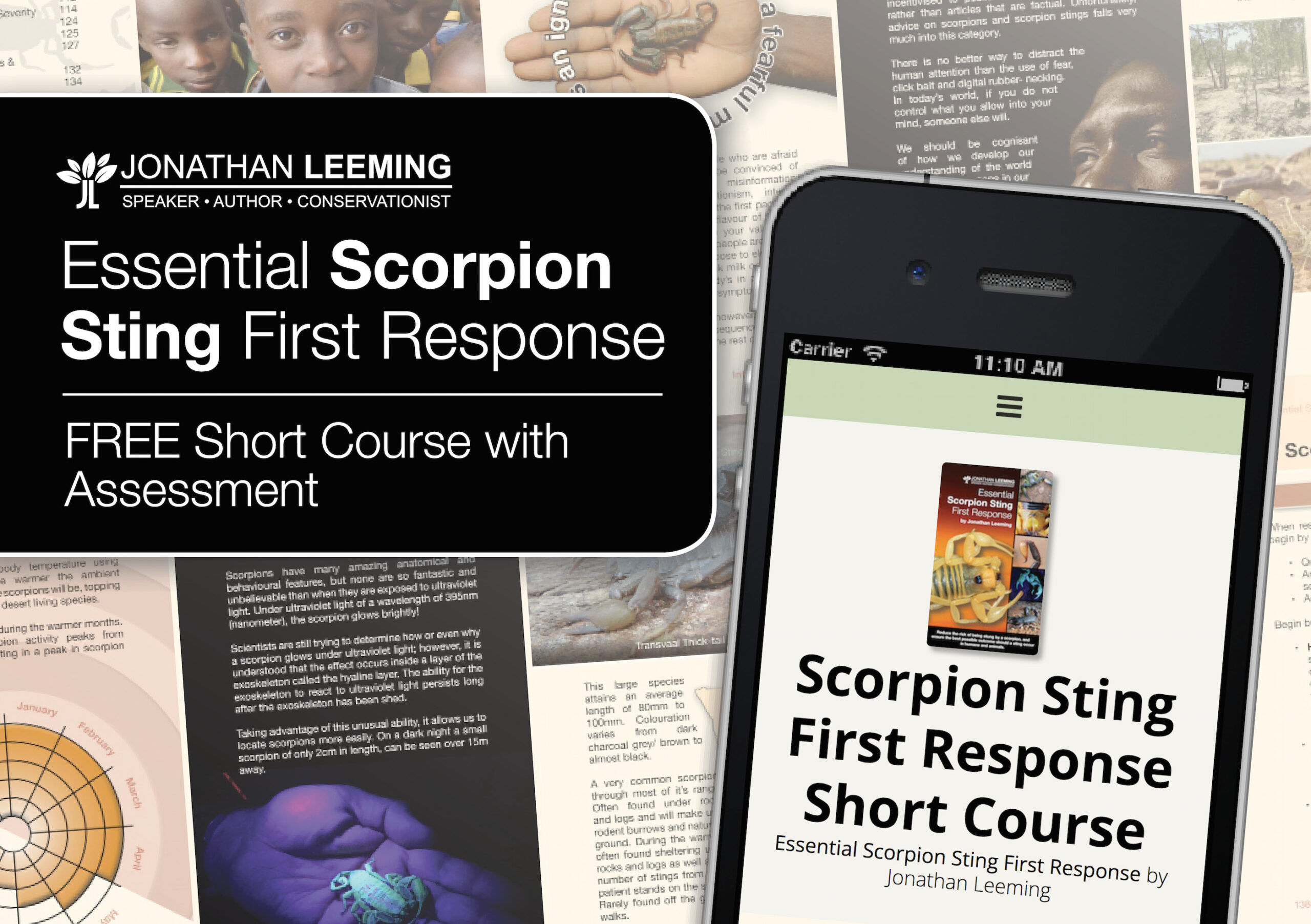 Jonathan Leeming's new book, Essential Scorpion Sting First Response, is out. He has used some of the book content to create a free short course on Scorpion Sting First Response. The book focuses upon reducing the chance of being stung by a scorpion, and if there is a scorpion sting, how can you ensure the best possible outcome for stings in humans and animals.
