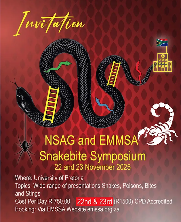 The National Snakebite Advisory Group and Emergency Medicine Soceity of South Africa are hosting the South African Snakebite Symposium, held on the 22nd and 23rd November 2025 at Pretoria University. It will be a gathering of the top specialists in their fields, coming together to tackle the challenge of envenomation in Southern Africa.
